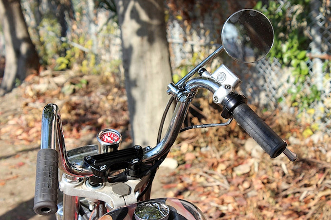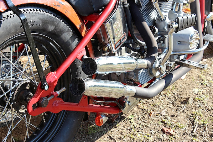 マフラーはT-SPORTオリジナルのビンテージサイレンサー。取り回しの荒っぽさがまた往年のチョッパー的雰囲気を盛り上げる。