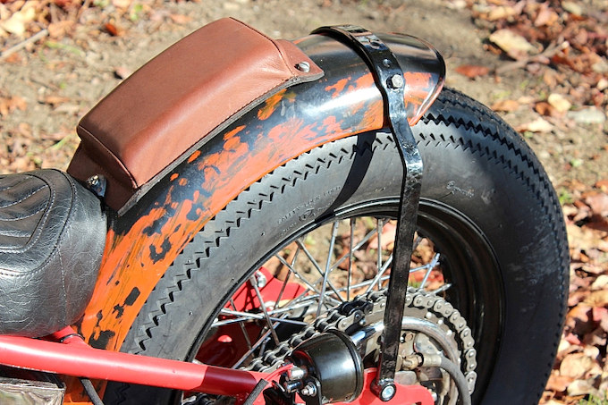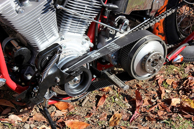 古今東西、チョッパー定番のカスタムパーツであるオープンプライマリー。こちらはプリモ製の2インチベルトを用いている。