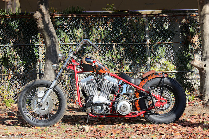 基本スタイルは70年代あたりを思わせる物であり、特にフロントに装備されたデュアルのスクエアヘッドライトなどにその特徴が見られるが、搭載されているエンジンは走りを重視したH-Dのエヴォリューション。S&S製Eキャブを組み合わせ、 V ツインの鼓動感とトルクフルな走りが楽しめる仕様となっているが、しかし特筆すべきはそのルックス。T-SPORTによって行われたこの塗装は、一見相当年期が入っているように見えながら、実はツヤ消しのダメージペイントなのである。エンジン、そして外装パーツのほとんどは新品でありながら、その雰囲気はまさに長年走り込んだチョッパー。これはなかなかに斬新なアイデアであろう。