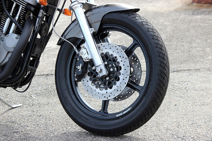 カスタムのきっかけとなったマグタン・ホイール。単体で持つとその軽さに誰もが驚く。キャリパーはブレンボ製。