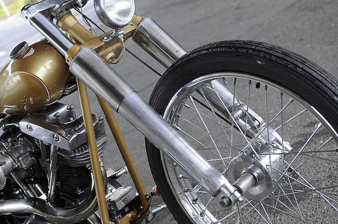 ロー&ロングの車体にゴールドカラー、そしてホワイトシートの組み合わせが、なんとも艶らしい雰囲気を醸し出している。ヘッドライトのマウント位置やハンドルバーの造形も絶妙で、シンプルなシルエットながらも、高い存在感を放つ。