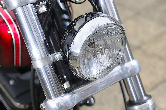 小振りなヘッドライトはオールドスタイル。フロントフォークにクランプでマウントされる。