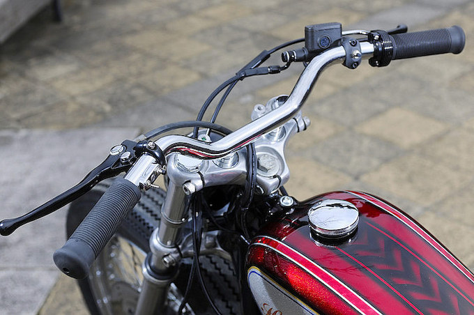ディテイルも見所満載だ。オリジナルのシンプルなライザー一体のコンチバーや、ワンオフのショートエキゾースト、小振りなオールドタイプのリアフェンダーや、オリジナルのラウンドタイプエアクリーナーカバーなど、ストリートバイクらしくハイテクパーツは使わず、オールドテイスト溢れるパーツをチョイス。コンセプトに基づくマシンの統一感に溢れ、まとまりのある一台となった。