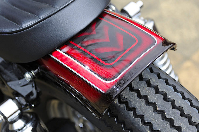小振りなリアフェンダーはオールドタイプ。タンク同様のペイントが続く。タイヤはストリートらしいFirestone。