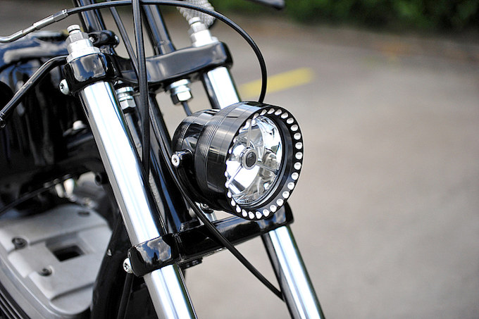 車体のイメージに合わせて選択したKEN’S FACTORY製ヘッドライト。シンプルで有りながらも確かに主張するアイテムである。