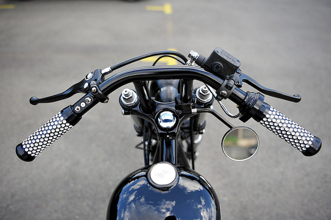 ワンオフのハンドルはライザー一体とし、トップブリッジからそのままエクステンド。配線類は中通しされ、スッキリまとめられる。