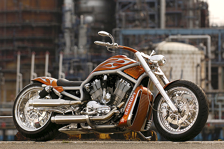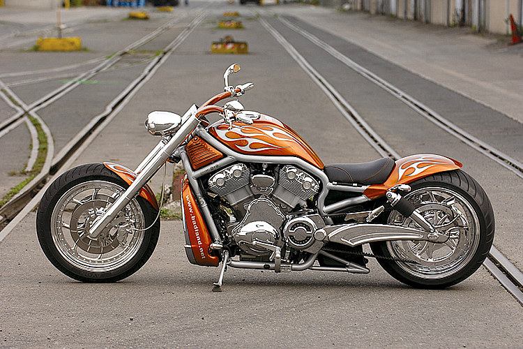 ストックのスタイリングを崩すことなく、ビレットパーツの質感と攻撃的なまでのペイントワークが調和したこのV-RODカスタムにいざ試乗。ハンドルバーはちょうど両手を広げた幅に設置、ステップはミッドコントロールとされる。街中を走れば注目の的。迫力のリアエンドはユーロばかりか、今やワールドスタンダードと言える。