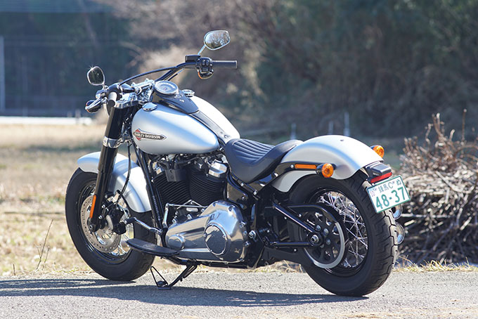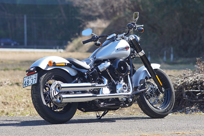 フェイス部分には大型ヘッドライトを配置し、サイド部分がシェイプされたフェンダーやハリウッドハンドルバーなどを採用するなどクラシカルなボバースタイルで纏められたソフテイルスリムは、不必要なパーツが省かれたことで、ソフテイルフレームの美しさをより強調させるものとなっている。ただ、その潔いシンプルさが、ソフテイルファミリーの中において、ひとつのベーシックスタイルと形容できるような存在となってきている。