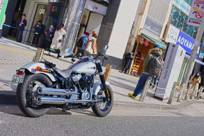 いつも車両をお借りしているハーレーダビッドソンジャパンの広報車両ヤードにて、そこに佇むソフテイルスリムを目の前にしたとき、「綺麗なバイクだな」ととっさに思ったことをよく覚えている。それは汚れている磨かれているという話ではない。全体的なシルエットはシュッと引き締められつつ、ワイドなフロントフォークや低めの位置にセットされたハンドルがしっくりと収まっており、全体的にアダルトな落ち着きを感じさせるのだ。以前のソフテイルスリムよりもバランスよく見えてしまうのは、気のせいなのかと考えながら、エンジンに火を入れ走り出した。