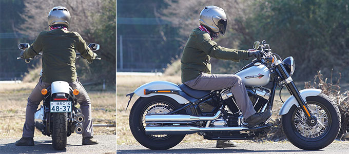 クラシカルな雰囲気を助長するポイントのひとつであるハリウッドハンドルバーは、思いのほか遠い位置にあるため、コーナーリング時には外側の手が持っていかれないように、意識して前かがみの姿勢を取るようにする。高速をクルーズしているような場合は別としても、この乗り方がソフテイルスリムを愉しむための大きなキーとなってくる。やや前傾姿勢になりながら前方のフットボードに足を添えてコントロールすれば、ソフテイルスリムはライダーの入力に対して従順に動く鉄馬となってくれる。