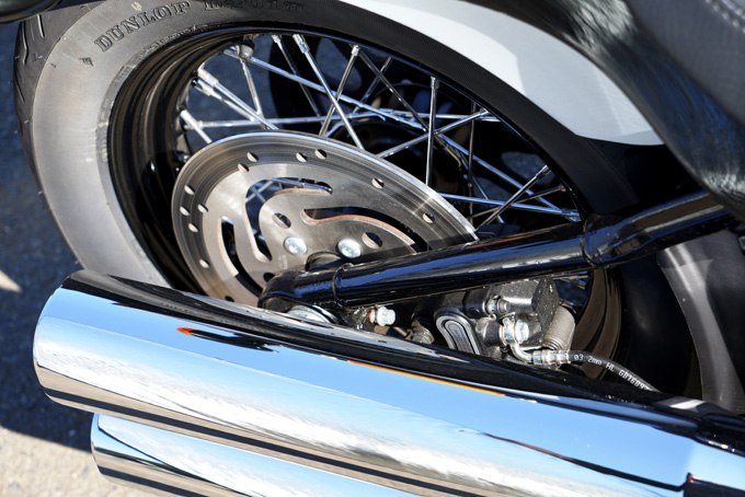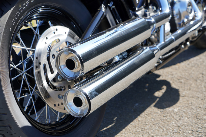 ミルウォーキーエイトエンジンが搭載される以前のソフテイルスリムのマフラーは、スラッシュカットタイプだったのに対し、現行モデルでは、等長カットとされている。鼓動感を持つ歯切れの良いエキゾーストノートを奏でる。