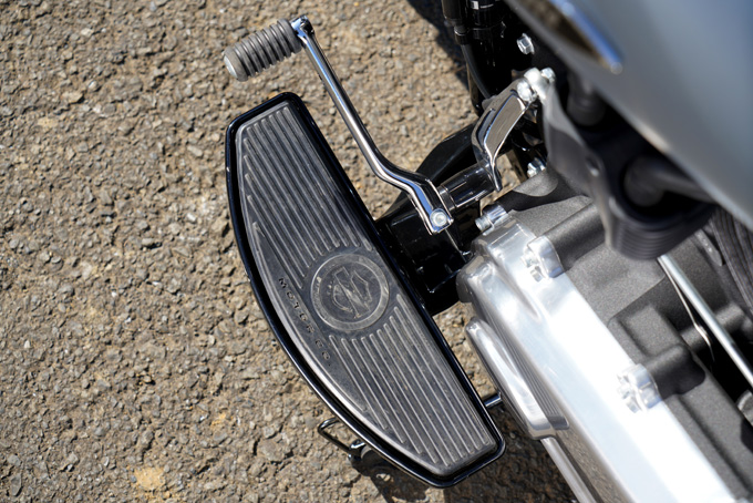 ビンテージスタイルに良く似合う半月型のフットボードを、フォワードポジション気味に装着。昨今のトレンドに合わせ、シーソーレバーは採用されていない。