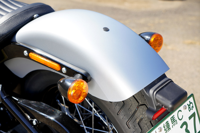 ハーレーダビッドソンのアイデンティティだとも呼べるようになったストップランプ一体型のウインカーを採用。150サイズのタイヤとの組み合わせもあり、テール周りはスリムに纏められている。
