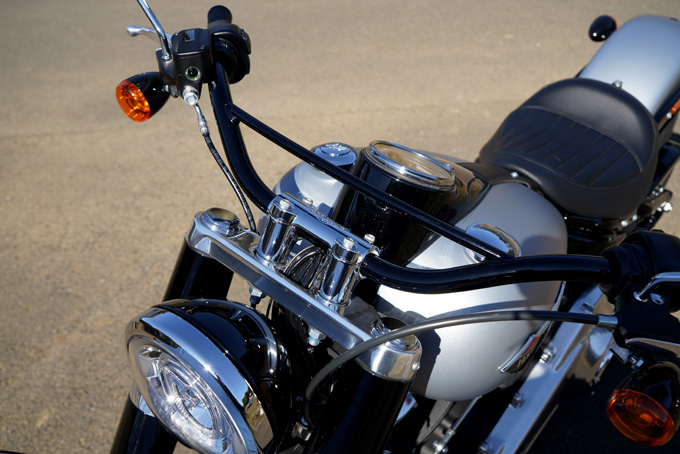 クロスバーを備えたハリウッドハンドルバーはブラックアウトされており、コクピット周りの印象を引き締めている。割と前方にセットされており、やや前傾姿勢のライディングポジションとなる。