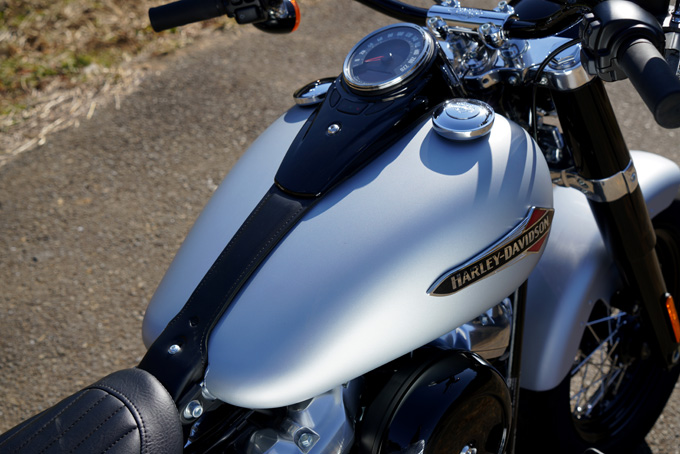 ファットボブ114やFXDR114など、前衛的なデザインとされたドラスティックなモデルが次々と投入される中で、どちらかというとコンサバティブな部類に当てはめられがちだが、その部分にこそソフテイルスリムの魅力があると思う。誰がどこから見てもハーレーダビッドソンだと認識させるスタイリングと、その中にもカスタムライクな一面を感じさせるディテールをエッセンスとして散りばめられたソフテイルスリムこそ、むしろストリートに映えるという言葉が良く似合うものだ。