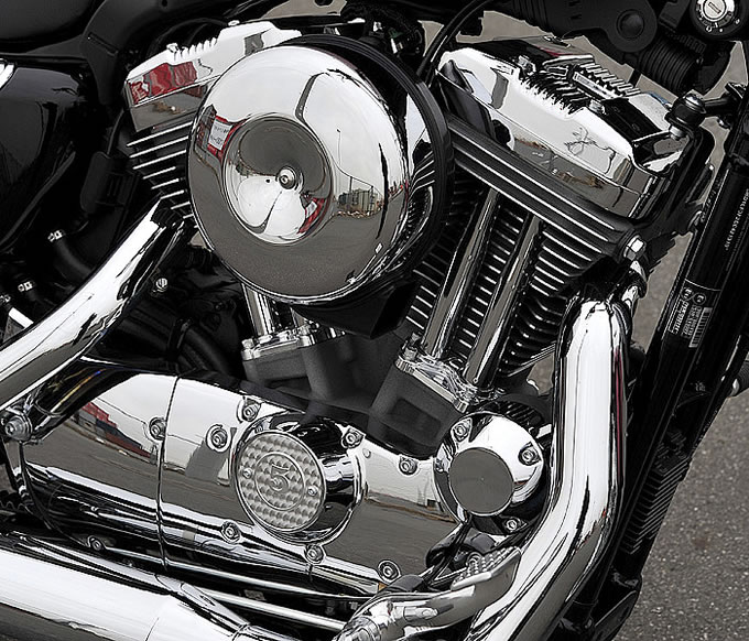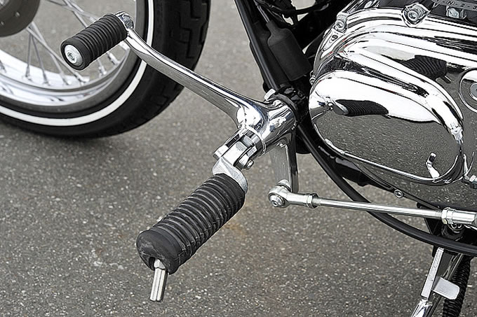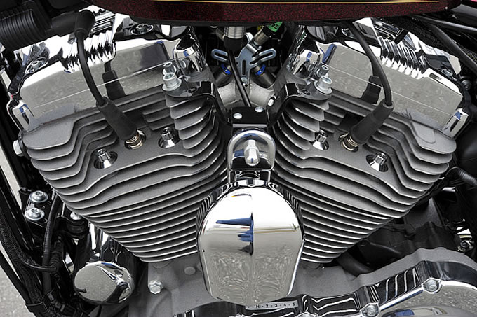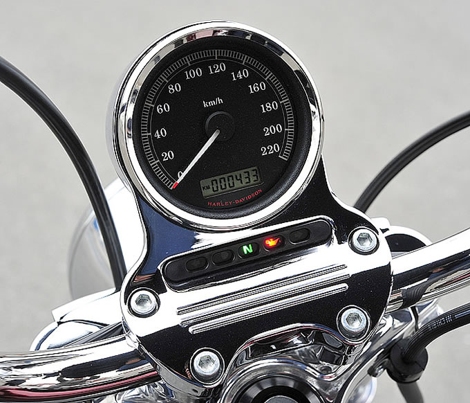 タンクからシート、リアエンドへと流れるラインは FORTY-EIGHT とお揃いのパーツが奢られていることから美しく形成されており、スタイリングについては申し分ない。フォワードコントロールとされるステップ位置も、同じく FORTY-EIGHT や XL1200C にも採用されているので特段珍しい部分というわけではない。やはり目を引くのは、スポーツスターファミリーのなかで唯一採用されているエイプハンガーハンドルバーだろう。スポーツスター用テレスコピックフロントフォークはその細長さがより強調され、 21 インチスポークホイールとの組み合わせから、真横から見たときに他モデルにはないチョッパーライクなフォルムが印象に残る。実際に跨ってみると、身長174センチのライダーだとハンドルの高さは肩よりやや低いぐらいの位置で、足を突き出すステップポジションとのセットにはオリジナリティを感じる。