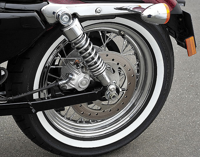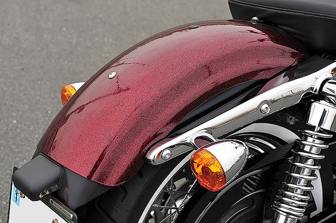 FORTY-EIGHT に搭載されている容量 7.9 リットルのピーナッツタンクにコンパクトなソロシート、ストップランプ一体型ウインカーと組み合わさったチョップドリアフェンダー、クロームメッキに覆われた最新のフューエルインジェクション仕様の Evolution エンジンに8 in ディッシュラウンドエアクリーナー、真っ白なリボンが印象的なホワイトウォールタイヤの採用など、高性能な最新のスポーツスターをベースに 1970 年代のチョッパーカスタムで知られる要素を取り入れた、新旧バランス良く融合したモデル―― Seventy-Two を評するとこんな感じになるだろうか。3つ用意されているカラーリングのひとつ、ビッグレッドフレークに見られるメタルフレークペイントなどは、70年代カスタムのアイコンとも言えるポイント。“72”の名の由来は、イーストロサンゼルスの伝説的なクルージングルート“ルート72”への敬意からとのことだから、まさしく現代に蘇った’70s チョッパーカスタムモデルである。スポーツスターのラインナップを見渡すと、そのインパクトはアタマひとつ抜けており、存在感という点では人気モデルである XL1200X FORTY-EIGHT と互角と言えるのではないだろうか。