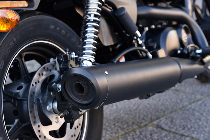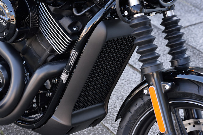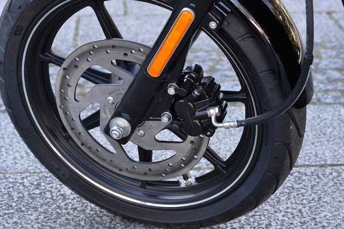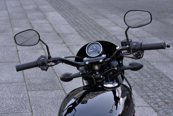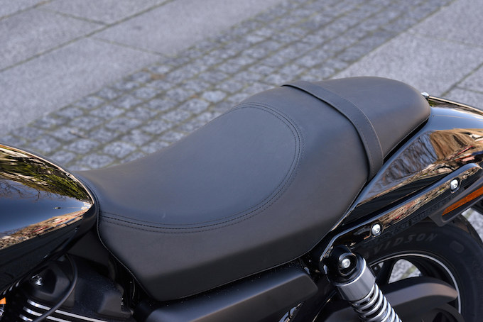 実際に車両を目の当たりにすると、そのフォルムはハーレーダビッドソンというより日本製のネイキッドバイクを思わせる仕上がりだ。ベーシックなスポーツバイク。エンジンもVツインではあるが、挟角は60度だし、フレームダウンチューブにセットされたラジエターを見るまでもなく冷却フィンの形状から水冷であることが分かる。跨ってみても然り。目に入るハンドルバーは1インチのハーレーに対して7/8と国産同様で(もちろんグリップも細い)、バー&シールドが文字盤に刻まれるシンプルなスピードメーターも小ぶりなもの。やや前よりのステップに足を置くと、ボリュームあるフューエルタンクはうまい具合に股に収まり、自然とニーグリップする姿勢となる。肉厚のシートはクッション性に優れ、ホールド感も極めて高そうだ。