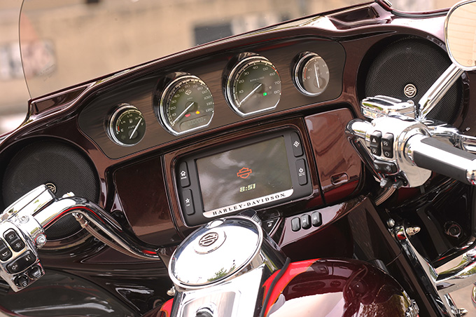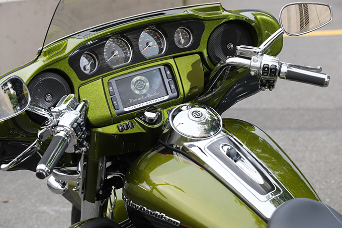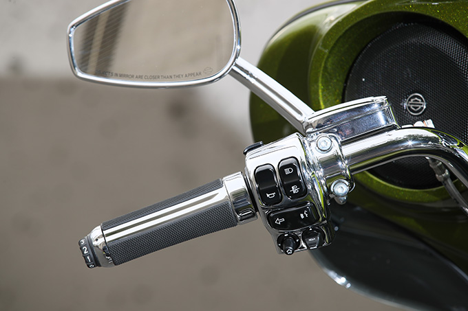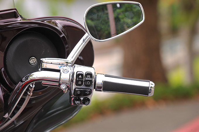 グリップやスイッチボックスにもクロームパーツが惜しみなく投入され、CVOならではの豪華な仕上がり。インフォテインメントシステムはインナーフェアリングに埋め込まれるタッチパネルでも操作できるが、ハンドスイッチでもコントロールすることが可能。