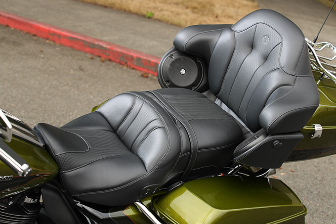 ペアライドでのロングライドを前提としたハーレーのFLH系モデル。CVOリミテッドでは温度調整ができるヒーテッドシートを備え、さらに前後独立でコントロールできる操作スイッチも左側面に配備する。リアスピーカーといい、パッセンジャー用オーディオスイッチといい、後部シートもまた快適そのものだ。