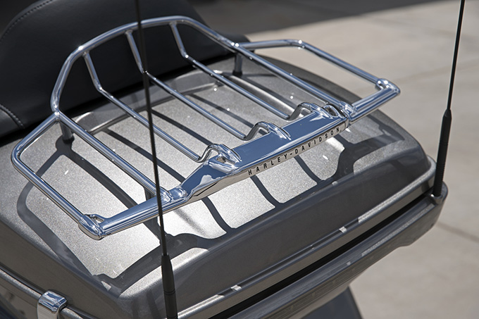 ツアーパックの上にはラゲッジラックを装備。ラックはベースモデルとなるウルトラリミテッドにもあるが、CVO用ではクロームがより上質で形状も異なった専用パーツが与えられる。エンド部分にはHARLEY-DAVIDSONの文字が誇らしげに刻まれた。