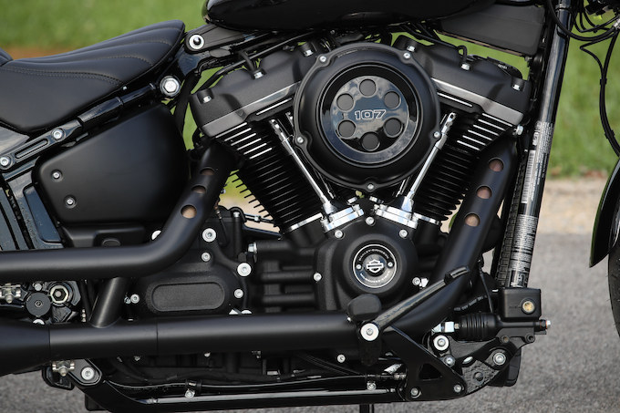 ボア100mm×ストローク111.1mmのミルウォーキーエイト107(排気量1,745cc)をリジッドマウントで搭載。シリンダーヘッドからミッションケースに至るまでリンクルブラックで仕上げられ、プッシュロッドカバーなど僅かな部分にクロームを用いてコントラストを演出している。