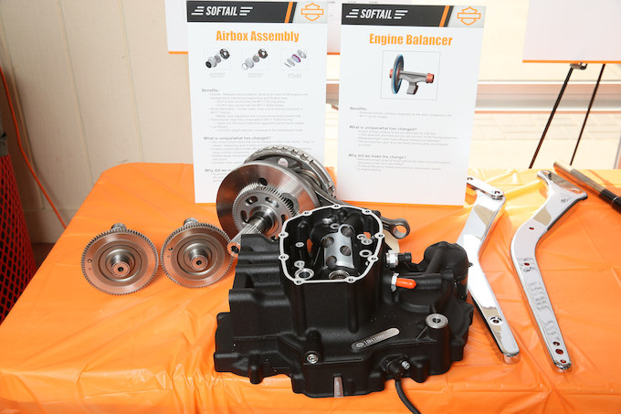 ミルウォーキーエイトエンジンのクランクシャフトに備えるカウンターバランサー。ツーリングファミリーではシングルだったが、ニューソフテイルではデュアル化。リジッドマウントならではの振動への対策だ。
