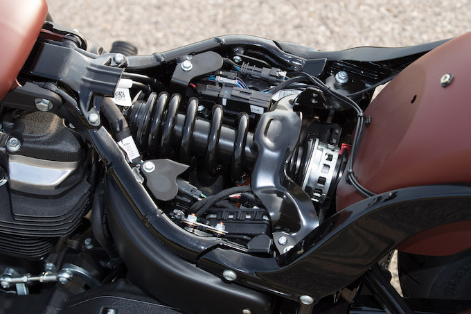 シートを外すと、モノショック式のリアサスペンションが姿を現す。5段階のプリロード調整が可能。ストローク量が増えるとともに、マスの集中に貢献。シートレールを軽量化するなどモノサスの利点は多い。