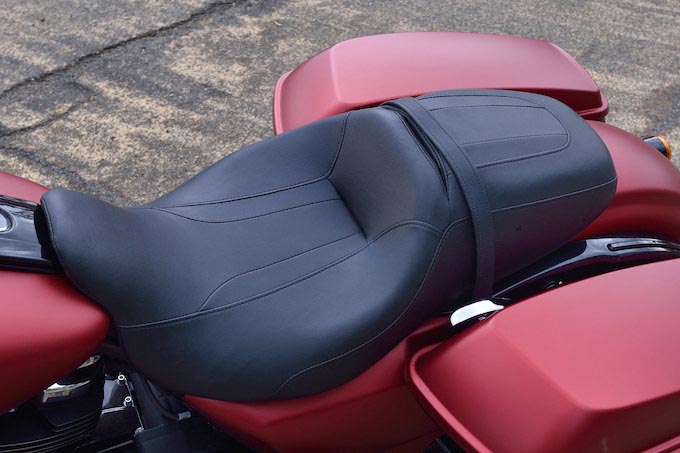 容量22.7リットルのフューエルタンク。メーターダッシュはブラックアウトされている。こちらのカラーはマットカラーのウィキッドレッドデニム。その他、ビビッドブラック、ビリアードブルー、インダストリアルグレーデニム、スコーチドオレンジ/ブラックデニム、シルバーフラックス/ブラックヒューズの計6色が用意されている。
