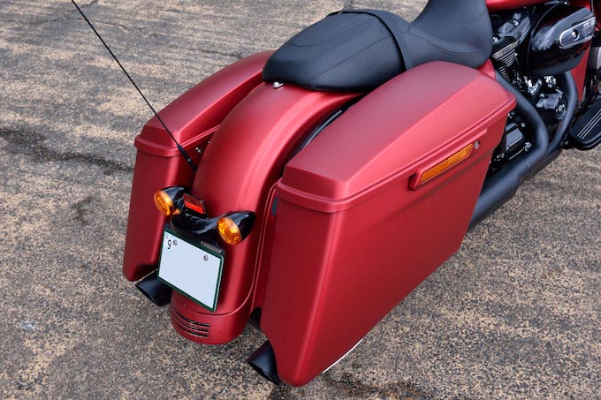 ストレッチタイプのサイドバッグを装備しバガーライクなリアエンドを入手。テールランプと一体式のウインカーが採用されている。ウインカー&ステーもブラックアウト。