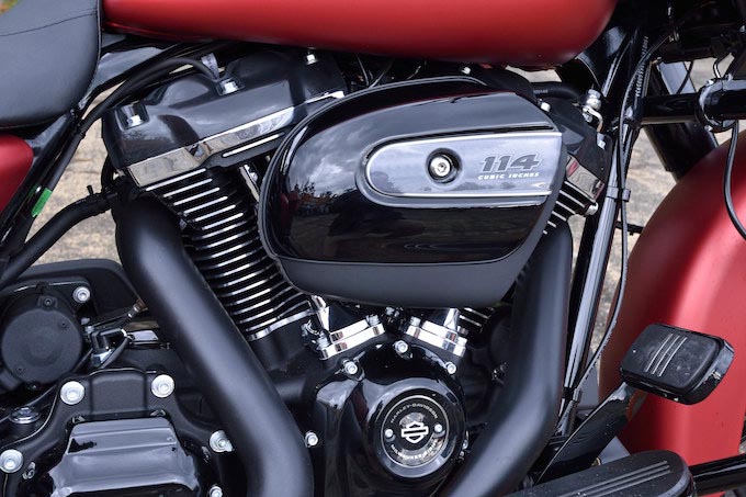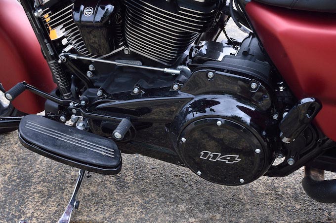 ブラックアウトされた排気量1,868ccのミルウォーキーエイト114。ロッカーカバーとフィン、タペットブロック、プッシュロッドカバーをクロームにすることでアクセントとしている。