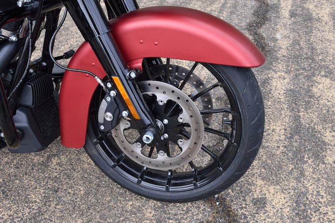 ロードグライドのアイデンティティーとなるシャークノーズフェアリング。その風防効果は絶大である。LEDのダブルヘッドライトにショートタイプのウインドシールド、その下には開閉可能なエアインテークが装備されている。