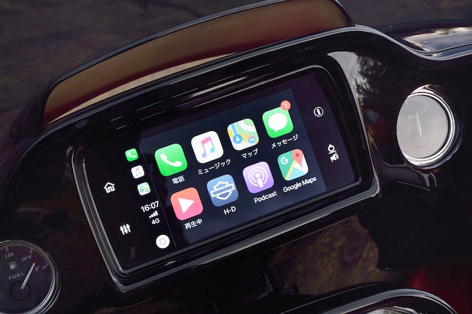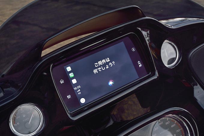 Apple CarPlayに対応した最新のインフォテイメントシステム。ナビ機能、電話、メッセージ、音楽などをiPhone経由で楽しむことができる。有線接続には純正アクセサリーのミュージック&コミュニケーションキット(品番:69200865)とブームオーディオ・ヘルメット・プレミアム・ミュージック&コミュニケーションヘッドセット(品番:77117-10)が必要。無線接続にはワイヤレスヘッドセット・インターフェースモジュール(品番:76000768)とブームオーディオ・20S EVO Bluetoothヘルメットヘッドセットのシングルヘッドセット(品番:76000736A)か、デュアルヘッドセット(品番:76000740A)が必要となっている。