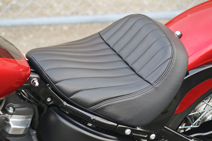 ビンテージ感を演出する縦型ステッチ仕様のタックロールシート。フレーム構造もあって、この辺りにソフテイルモデルらしさを強く感じる。