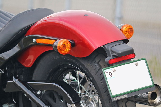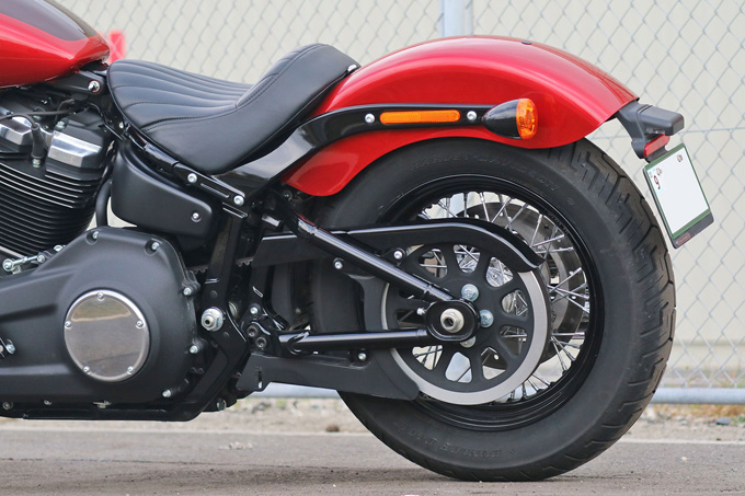 ツインショック構造ではないソフテイルフレームを軸としつつ、かつてのストリートボブらしいチョップドスタイルが踏襲されているリアエンド。細身のスタイルがいかにも70’sだ。