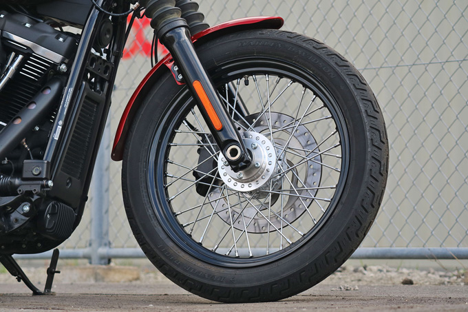 LED仕様のラウンドヘッドライトとフォークブーツがクラシカルな雰囲気を醸し出す。上下トリプルツリーやアウターチューブがブラックアウトされているところはストリートボブならでは。