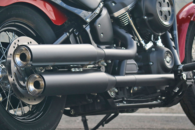 ショットガンスタイルの2本出しマフラーにはフルブラックのカバーが備わる。エキパイにもパンチアウトされたカバードが。