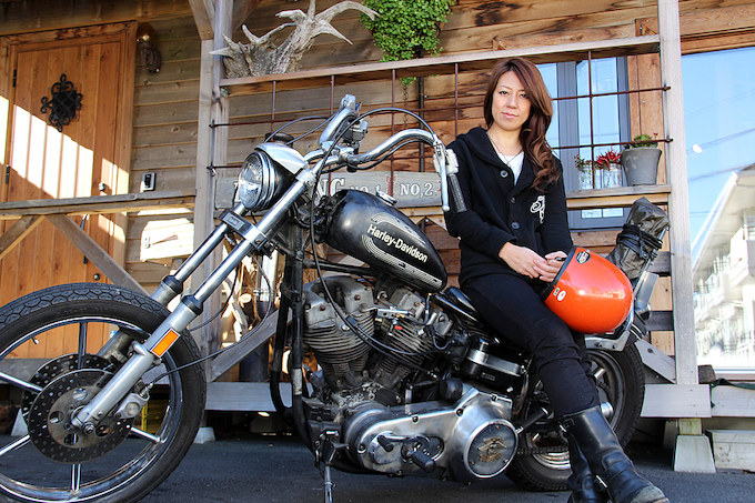 最初からハーレーに乗りたいと心に決めていた彼女は、中型免許を取得するのと同じくらいに大型免許を取得。しかし、いきなり大型を運転させるのに不安を覚えたご主人は、所有していた250ccのオフロード車を彼女に乗せ、河原でよく練習させたのだとか。そのご主人の愛情溢れた特訓の成果もあって、いざハーレーを所有してからは多くの仲間と安心して走ることが出来るように。ちなみに現在のショベルを選んだ理由というのは、旧いスタイルが好きなのと自分が乗ることのできるサイズ感だったから、とのこと。
