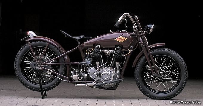 ハーレーワークスレーサーは1916年に作られた1カム構造のモデル17にはじまり、19年の前後シリンダー別作動の2カムに発展し、ワークス用として確立した。28年型から登場したJDHとJHの生産に合わせて他の市販ハーレーにもはじめてフロントブレーキが装備された。スプリングを内蔵したフロントフォークは「キャッスルフォーク」の名で知られている。こちらのJDH TTレーサーは量産JDHとは各部が異なり、レーシングパーツが随所に散りばめられている。