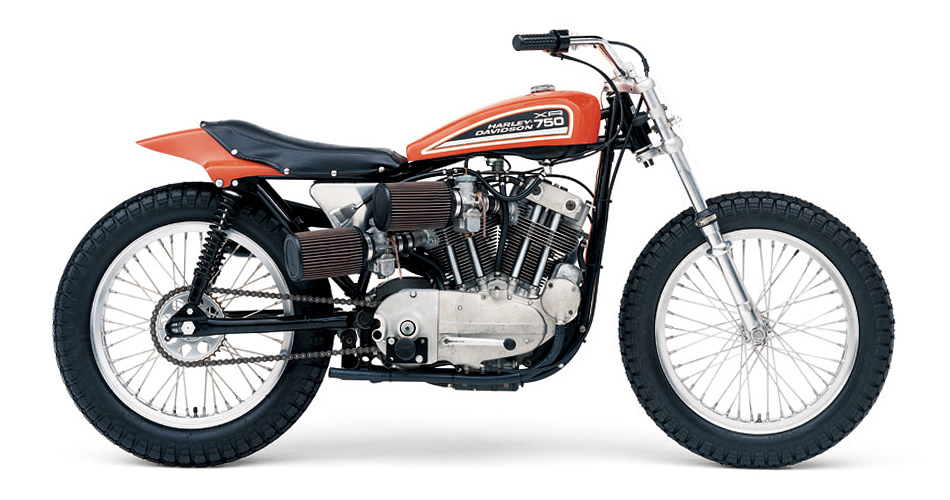 70年に登場した鋳鉄ヘッドの初期型XR750の発展型、アルミヘッドが採用された72年式のXR750。この車両はダートラシーンの中心となってきた伝説のレーサーだ。当時のレース部門の長を勤めていたディック・オブライエンにより生み出されたニューエンジンはアルミ合金の採用により飛躍的な性能アップが図られた。2.5ガロンのフューエルタンクとシートカウルの造型、ジェットファイヤーオレンジのカラーリングやタンクロゴは現行のXRモデルにも受け継がれている。