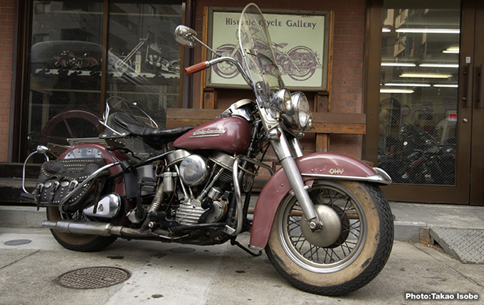 低く身構えたシルエットが魅力的な51年型パンヘッド。53~55ps/5400rpmによって最高速160km/hをマークしたFLユニットを搭載している。ゼロヨンは15秒台で当時のモーターサイクルでは最速の部類であった。エンジンにはオプションであったDリングが標準装備となったのが、この51年式モデルから。大型のフェンダーチップは当時のオプションパーツが装着されている。OHV Deluxeプレートが誇らしげである。ネームプレートはハンサムスクリプトを採用。