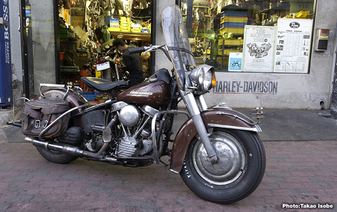 ホイールキャップやフェンダーガードなどでドレスアップしたフロント周りを持つ1952年型のFLパンヘッド。ファイアストンの標準タイヤはこの年までで、後にグッドイヤー製となる。パワーユニットは排気量74ciのオーバーヘッドバルブツインを搭載。ブラックペイントが施されたメーターダッシュに、同じくブラックの透過式スピードメーターが取り付けられている。また52年には待望のフットギアシフト&ハンドクラッチモデルのFLFがラインナップに加わった。