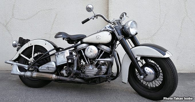 ここに紹介する1956年型のハイドラグライドはフューエルタンクに残るディーラーステッカーからオークランド近辺に存在していた車両であることが想像できる。ブラック&ホワイトのペイントや右サイドに突き出したオイルタンク、ヤンキー製の大型ウインカーなどからポリスモデルだったことが分かる。この時代のポリスバイクにはクロームパーツやアクセサリーが取り付けられていることが多い。当時の警察官のバイクへの思いを垣間見ることができる車両と言える。