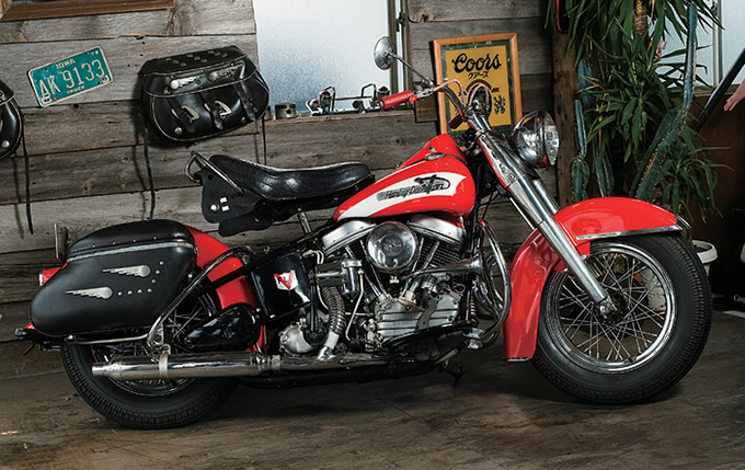1955年にデビューしたFLHはパンヘッドとして初のスーパースポーツソロと銘打ったモデルであり、それまでのFLモデルのエンジンと比較すると大幅にアップデイトされ、ポテンシャルが向上している。クランクケース内にインストールされたホットなビクトリーカムこそが、この年代のFLHのアイデンティティーである。こちらは56年式FLHで、エアクリーナーカバーは増大した振動のために脱落や破損対策としてセンタースクリューで留められるように変更されている。