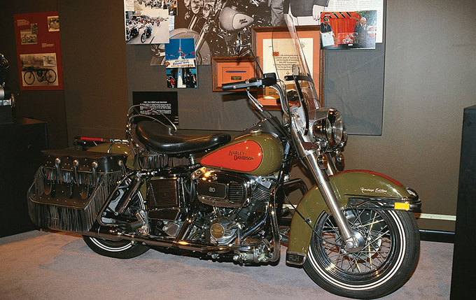 1969年にAMFの傘下となり、品質低下が叫ばれるようになったH-Dカンパニー。そんな中、81年にウイリー・Gをはじめとする12人の首脳陣によりAMF傘下から脱却。このバイバック運動により不死鳥のごとく蘇ったカンパニーのラインナップは、ショベルヘッド時代の中でも最も多かった。ここに紹介するグリーン&オレンジで古のFLをイメージさせるFLHヘリテイジは、バイバックを成し遂げた記念すべきモデルと言える。もちろんこのカラーリングは81年のみ。