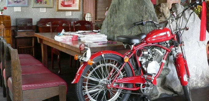 店内は、上品で親しみのある雰囲気が漂い、訪問者をゆったりと気分にさせてくれる。さりげなく置かれた、モペットクルーザーには古いハーレーエンジンのレプリカが搭載されており、それを見るだけでも楽しめるのもうれしい。ライダーに人気のメニューは「珈琲と鬼まんじゅう」セット。「養老の滝」源泉から汲んできた天然水で点てられたコクのある珈琲に、尾張地方の名物の「鬼まんじゅう」は絶品だ。しっかりと食事をしたい人には、カレーライスがオススメ。オーナー自らが畑で栽培した無農薬野菜を使い、じっくり煮込まれたカレーライスには注文が絶えない。朝から「竹の宿」でのんびり過ごし、午後からは軽くショートツーリング。そんな贅沢な一日もたまにはいいものだろう。