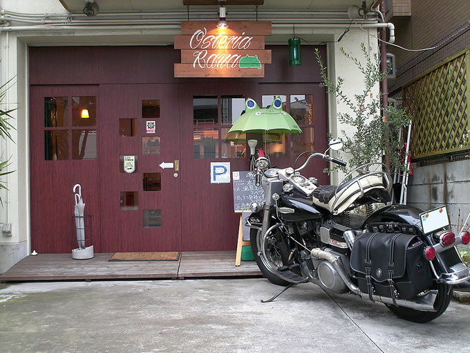 関西の地下鉄御堂筋線・江坂駅の周辺は、閑静な住宅地として知られている。今回ご紹介するお店「オステリア ラナ」は、そんな地域にあるこぢんまりとしたイタリアンレストランで、看板はご主人の愛車である’69年式のアーリーショベル。37歳という若さながら、ファットボーイなど3台のビッグツインを乗り継いできた筋金入りの鉄馬乗りだ。