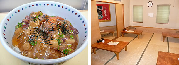 自慢の海鮮物を引き揚げる銚子漁港の前に陣取っているのが、この魚料理屋「海ぼうず」だ。オーナーの名洗(なあらい)さんは若い頃に東京で10年板前修業をし、故郷の銚子でこの料理屋をオープンした。2010年春に10年目を迎える海ぼうずでは、取れたての新鮮な魚を手早く調理して提供してくれる。中でも「あぶらぼうず照焼」(1,200円)や「きんめ鯛の姿煮」(1,600円~)、「具だくさん!海鮮づけ丼」(1,400円/写真右上)などなど、名前を聞いただけでツバを飲み込んでしまいそうなラインナップが待ち受けている。