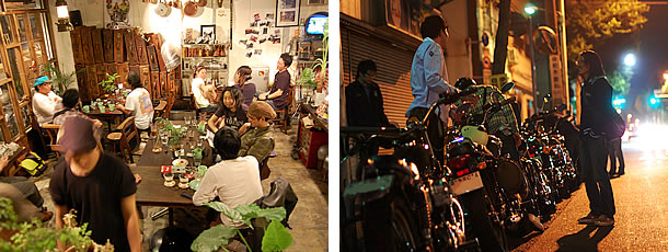 駐車スペースがないため、どうしても路上駐車を余儀なくされてしまうのだが、ハーレーや英車、絶版の国産車など、ヴィンテージバイクという共通の趣味を持つ者同士が楽しめる空間である。