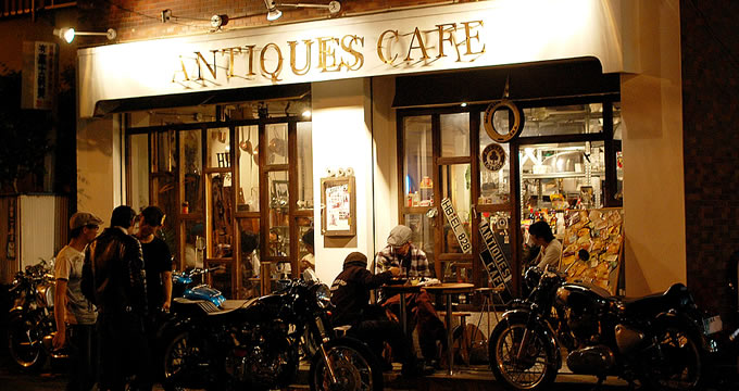 一見すると、アンティーク雑貨が揃うお洒落なカフェだが、実際に訪れるとトライアンフや BSA といったクラシック系のバイクが店頭に並ぶ。そしてお店のエンブレムは、オーナーの中川さんがリスペクトしているイギリスの伝説のライダーズカフェ ACE CAFE LONDON を模したものだと窺い知れる。そう、ここはヴィンテージというキーワードで彩られた“オートバイ好きが集まるカフェ”なのだ。